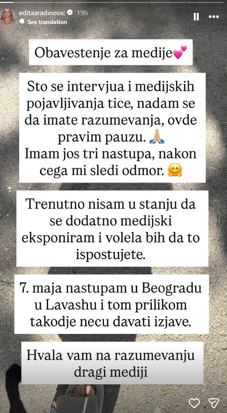 ‘Što se intervjua i medijskih pojavljivanja tiče, nadam se da imate razumevanja, ovde pravim pauzu. Imam još tri nastupa, nakon čega mi sledi odmor. Trenutno nisam u stanju da se dodatno medijski eksponiram i volela bih da to ispoštujete’ – poručila je Edita.